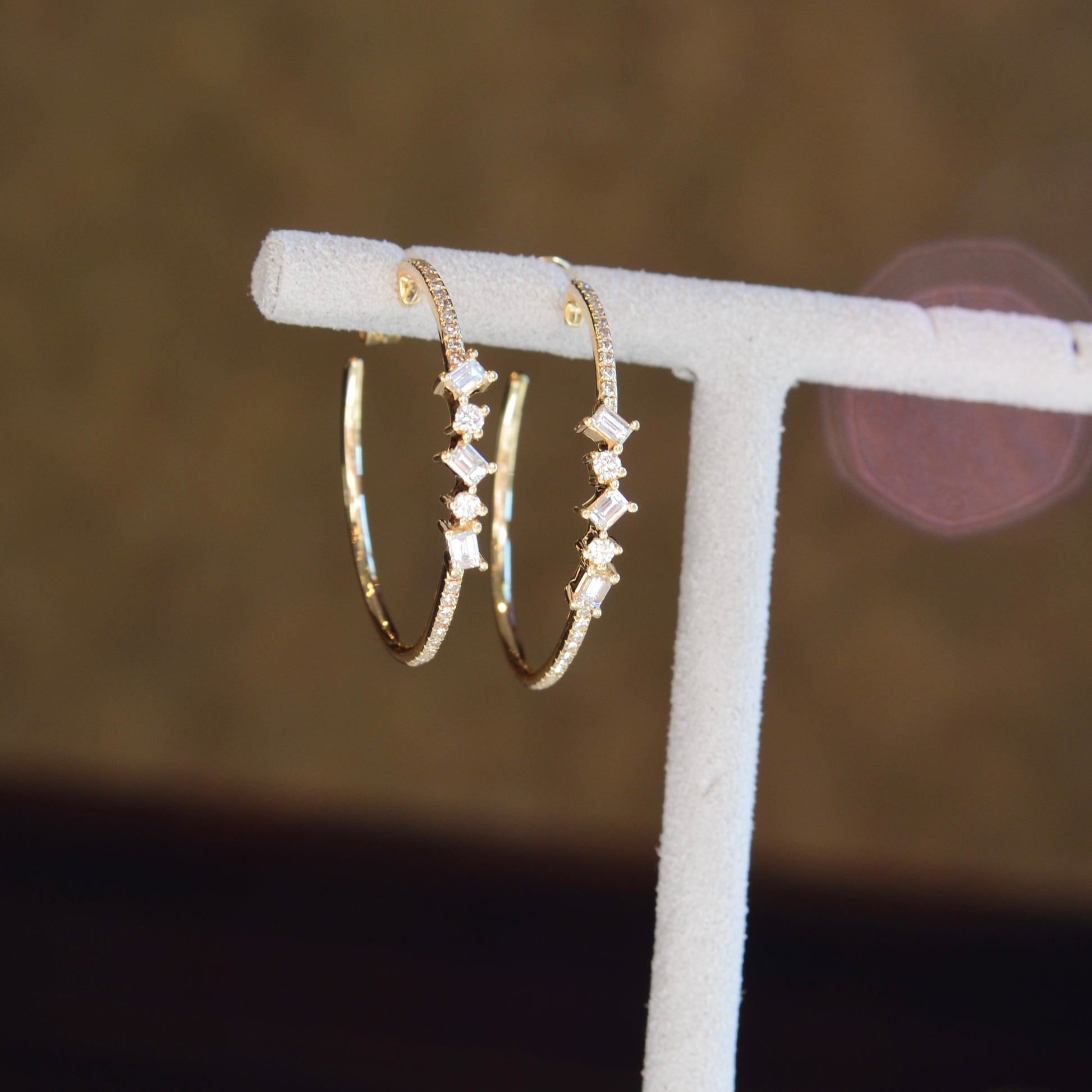 These yellow gold half hoop earrings strike the perfect balance between fun and sleek. Featuring a playful mix of round and baguette-cut stones, they catch the light—and attention—with every turn. Bold enough to stand out, refined enough to wear on repeat.
