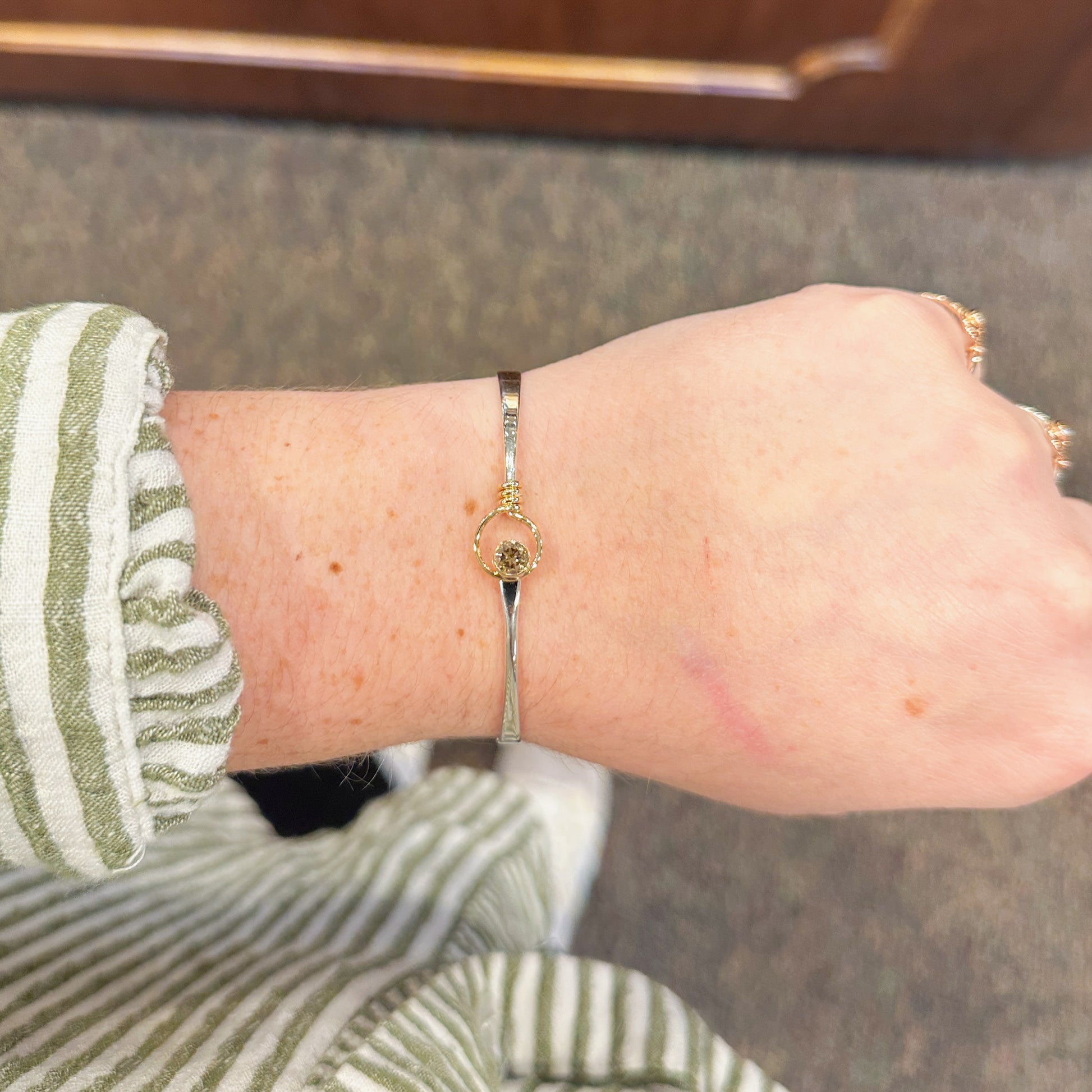 The classic Saratoga bracelet by Ed Levin, but with a twist! Set with a stunning champagne diamond, this piece is irresistible! Unique and oh so sparkly!